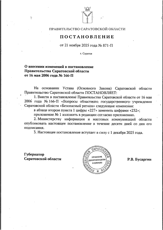 Постановление Правительства Саратовской области от 21.11.2025 N 871-П "О внесении изменений в постановление Правительства Саратовской области от 16 мая 2006 года N 166-П"