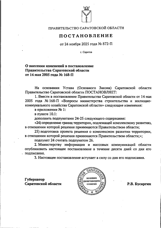 Постановление Правительства Саратовской области от 24.11.2025 N 872-П "О внесении изменений в постановление Правительства Саратовской области от 14 мая 2005 года N 168-П"