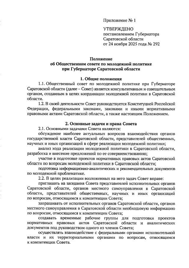 Постановление Губернатора Саратовской области от 24.11.2025 N 292 "Об Общественном совете по молодежной политике при Губернаторе Саратовской области" (вместе с "Положением об Общественном совете по молодежной политике при Губернаторе Саратовской области")