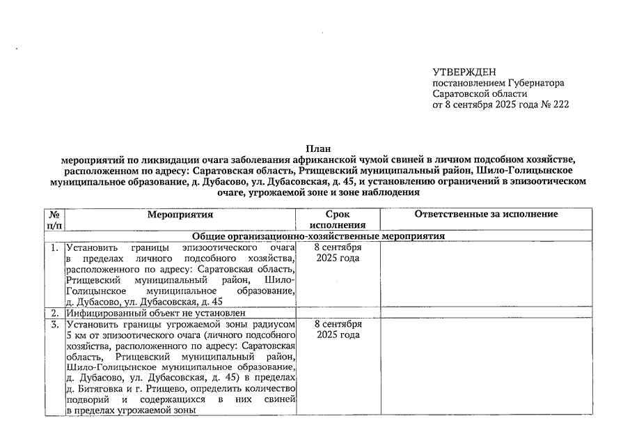 Постановление Губернатора Саратовской области от 08.09.2025 N 222 "Об установлении карантина по заболеванию африканской чумой свиней в личном подсобном хозяйстве, расположенном по адресу: Саратовская область, Ртищевский муниципальный район, Шило-Голицынское муниципальное образование, д. Дубасово, ул. Дубасовская, д. 45, и установлении ограничений в эпизоотическом очаге, угрожаемой зоне и зоне наблюдения"