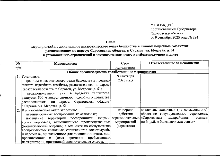 Постановление Губернатора Саратовской области от 09.09.2025 N 224 "Об установлении карантина по заболеванию бешенством животных на территории радиусом 500 м вокруг личного подсобного хозяйства, расположенного по адресу: Саратовская область, г. Саратов, ул. Медовая, Д. 51"