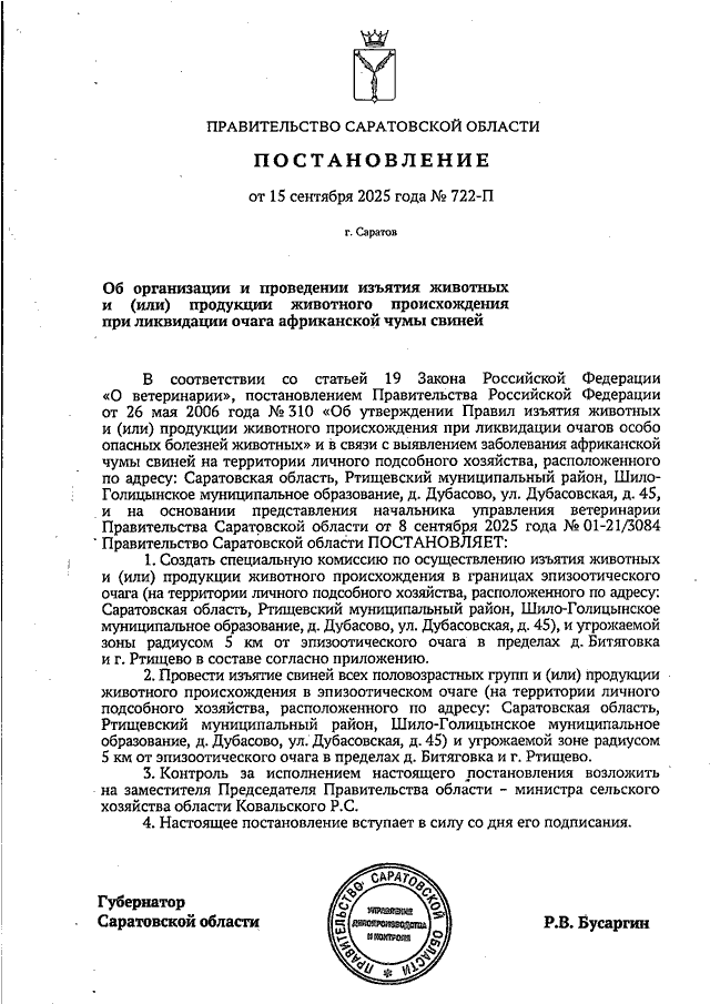 Постановление Правительства Саратовской области от 15.09.2025 N 722-П "Об организации и проведении изъятия животных и (или) продукции животного происхождения при ликвидации очага африканской чумы свиней"