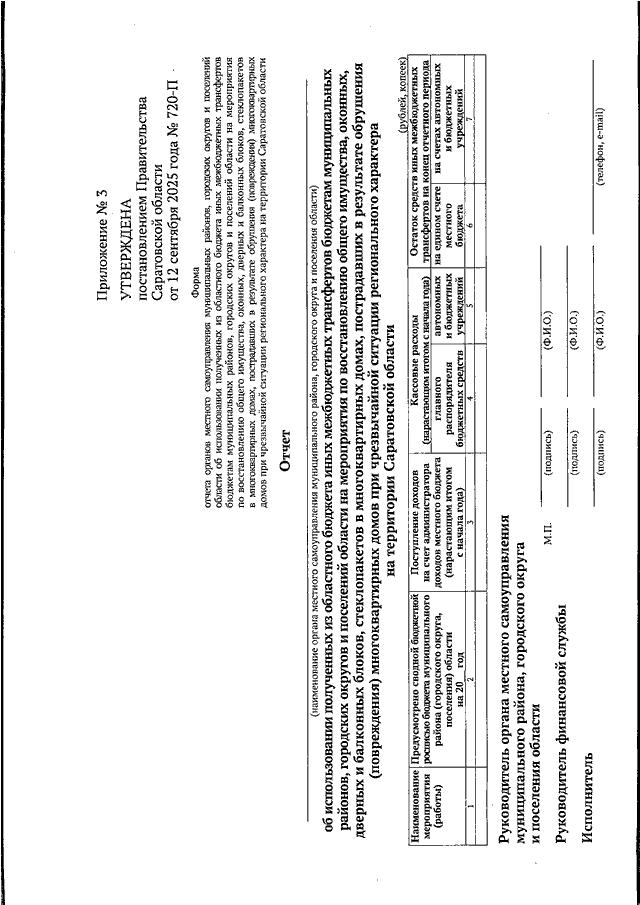 Постановление Правительства Саратовской области от 12.09.2025 N 720-П "О выделении средств из резервного фонда Правительства Саратовской области, методике распределения и порядке предоставления из областного бюджета иных межбюджетных трансфертов бюджетам муниципальных районов, городских округов и поселений области на мероприятия по восстановлению общего имущества, оконных, дверных и балконных блоков, стеклопакетов в многоквартирных домах, пострадавших в результате обрушения (повреждения) многоквартирных домов при чрезвычайной ситуации регионального характера на территории Саратовской области" (вместе с "Положением о методике распределения и порядке предоставления из областного бюджета иных межбюджетных трансфертов бюджетам муниципальных районов, городских округов и поселений области на мероприятия по восстановлению общего имущества, оконных, дверных и балконных блоков, стеклопакетов в многоквартирных домах, пострадавших в результате обрушения (повреждения) многоквартирных домов при чрезвычайной ситуации регионального характера на территории Саратовской области")