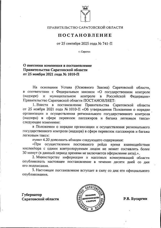 Постановление Правительства Саратовской области от 25.09.2025 N 741-П "О внесении изменения в постановление Правительства Саратовской области от 25 ноября 2021 года N 1010-П"