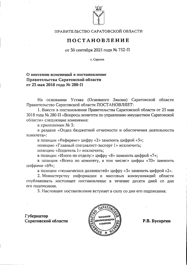 Постановление Правительства Саратовской области от 30.09.2025 N 752-П "О внесении изменений в постановление Правительства Саратовской области от 23 мая 2018 года N 280-П"
