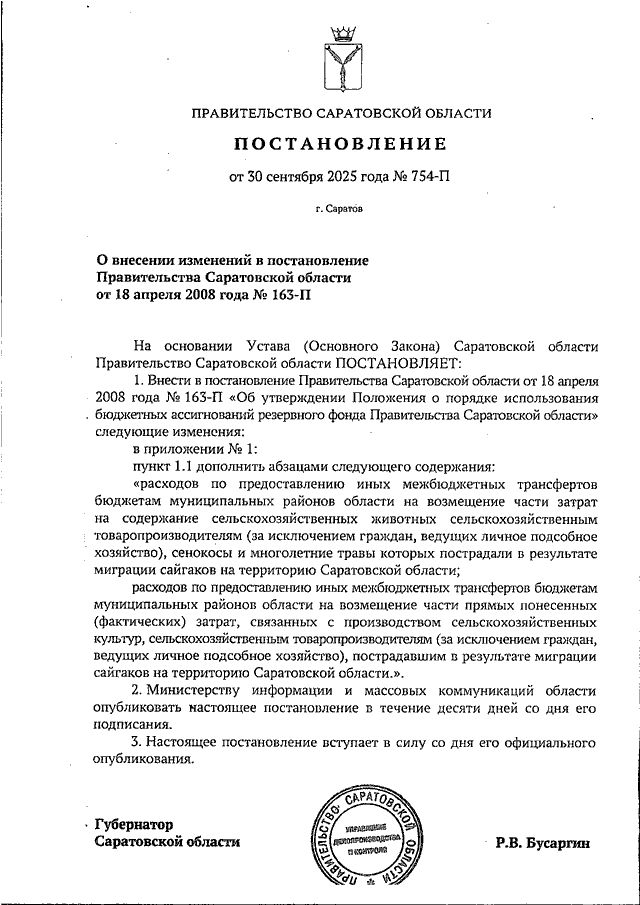 Постановление Правительства Саратовской области от 30.09.2025 N 754-П "О внесении изменений в постановление Правительства Саратовской области от 18 апреля 2008 года N 163-П"