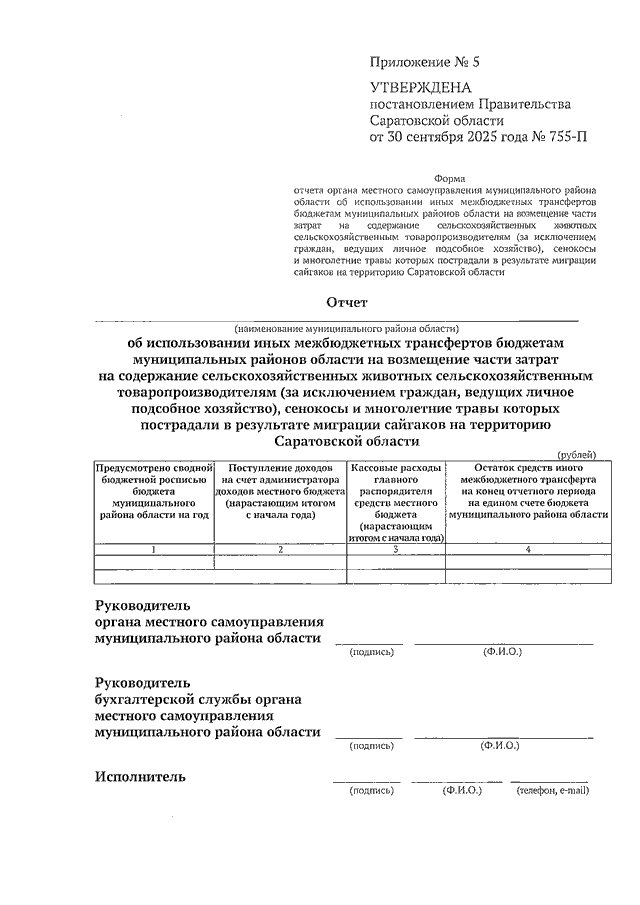 Постановление Правительства Саратовской области от 30.09.2025 N 755-П "О выделении средств из резервного фонда Правительства Саратовской области, методиках распределения и порядках предоставления из областного бюджета иных межбюджетных трансфертов бюджетам муниципальных районов области" (вместе с "Положением о методике распределения и порядке предоставления из областного бюджета иных межбюджетных трансфертов бюджетам муниципальных районов области на возмещение части затрат на содержание сельскохозяйственных животных сельскохозяйственным товаропроизводителям (за исключением граждан, ведущих личное подсобное хозяйство), сенокосы и многолетние травы которых пострадали в результате миграции сайгаков на территорию Саратовской области", "Положением о методике распределения и порядке предоставления из областного бюджета иных межбюджетных трансфертов бюджетам муниципальных районов области на возмещение части прямых понесенных (фактических) затрат, связанных с производством сельскохозяйственных культур, сельскохозяйственным товаропроизводителям (за исключением граждан, ведущих личное подсобное хозяйство), пострадавшим в результате миграции сайгаков на территорию Саратовской области")