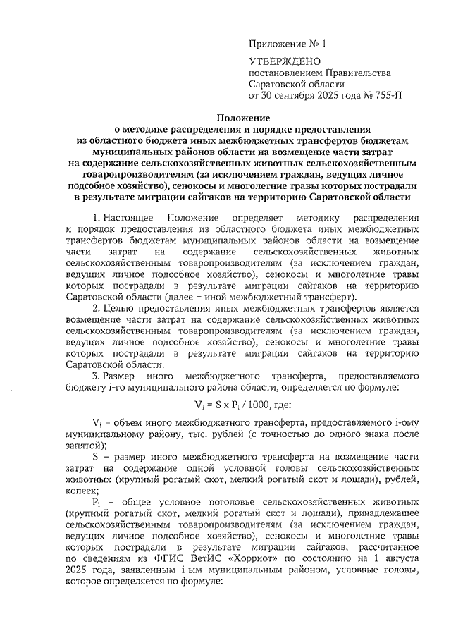 Постановление Правительства Саратовской области от 30.09.2025 N 755-П "О выделении средств из резервного фонда Правительства Саратовской области, методиках распределения и порядках предоставления из областного бюджета иных межбюджетных трансфертов бюджетам муниципальных районов области" (вместе с "Положением о методике распределения и порядке предоставления из областного бюджета иных межбюджетных трансфертов бюджетам муниципальных районов области на возмещение части затрат на содержание сельскохозяйственных животных сельскохозяйственным товаропроизводителям (за исключением граждан, ведущих личное подсобное хозяйство), сенокосы и многолетние травы которых пострадали в результате миграции сайгаков на территорию Саратовской области", "Положением о методике распределения и порядке предоставления из областного бюджета иных межбюджетных трансфертов бюджетам муниципальных районов области на возмещение части прямых понесенных (фактических) затрат, связанных с производством сельскохозяйственных культур, сельскохозяйственным товаропроизводителям (за исключением граждан, ведущих личное подсобное хозяйство), пострадавшим в результате миграции сайгаков на территорию Саратовской области")