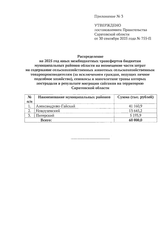 Постановление Правительства Саратовской области от 30.09.2025 N 755-П "О выделении средств из резервного фонда Правительства Саратовской области, методиках распределения и порядках предоставления из областного бюджета иных межбюджетных трансфертов бюджетам муниципальных районов области" (вместе с "Положением о методике распределения и порядке предоставления из областного бюджета иных межбюджетных трансфертов бюджетам муниципальных районов области на возмещение части затрат на содержание сельскохозяйственных животных сельскохозяйственным товаропроизводителям (за исключением граждан, ведущих личное подсобное хозяйство), сенокосы и многолетние травы которых пострадали в результате миграции сайгаков на территорию Саратовской области", "Положением о методике распределения и порядке предоставления из областного бюджета иных межбюджетных трансфертов бюджетам муниципальных районов области на возмещение части прямых понесенных (фактических) затрат, связанных с производством сельскохозяйственных культур, сельскохозяйственным товаропроизводителям (за исключением граждан, ведущих личное подсобное хозяйство), пострадавшим в результате миграции сайгаков на территорию Саратовской области")