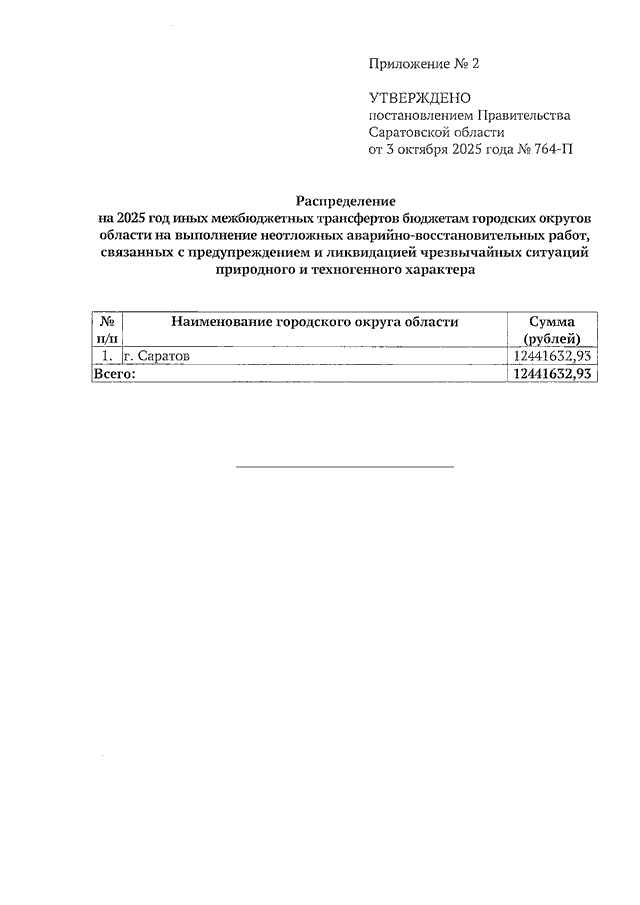 Постановление Правительства Саратовской области от 03.10.2025 N 764-П "О выделении средств из резервного фонда Правительства Саратовской области, методике распределения и порядке предоставления из областного бюджета иных межбюджетных трансфертов бюджетам городских округов области на выполнение неотложных аварийно-восстановительных работ, связанных с предупреждением и ликвидацией чрезвычайных ситуаций природного и техногенного характера" (вместе с "Положением о методике распределения и порядке предоставления из областного бюджета иных межбюджетных трансфертов бюджетам городских округов области на выполнение неотложных аварийно-восстановительных работ, связанных с предупреждением и ликвидацией чрезвычайных ситуаций природного и техногенного характера")