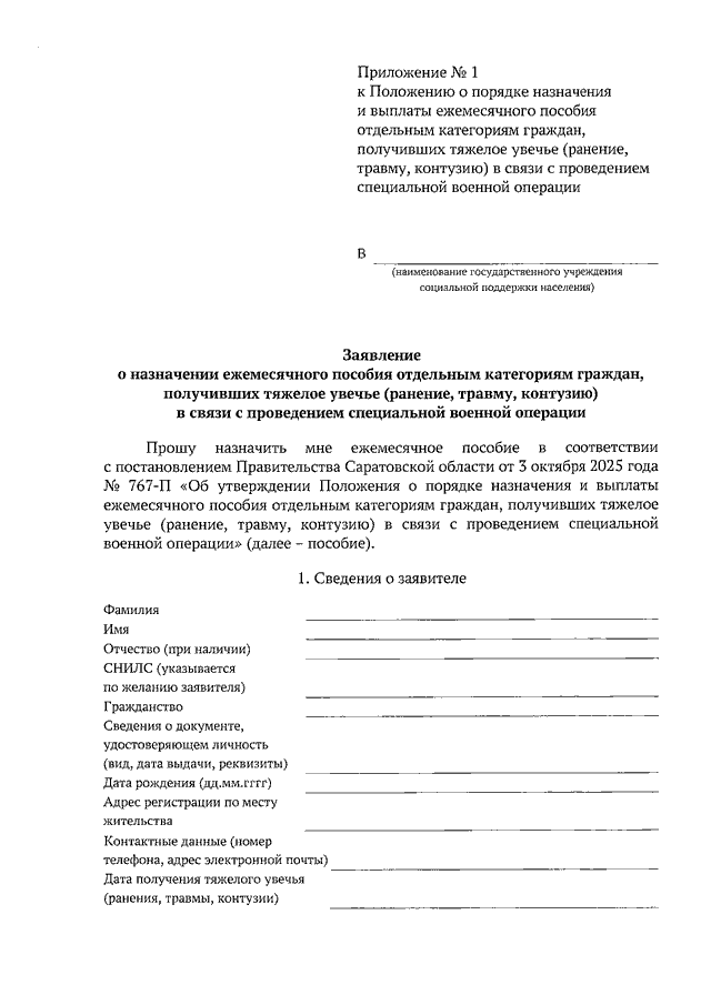 Постановление Правительства Саратовской области от 03.10.2025 N 767-П "Об утверждении Положения о порядке назначения и выплаты ежемесячного пособия отдельным категориям граждан, получивших тяжелое увечье (ранение, травму, контузию) в связи с проведением специальной военной операции"