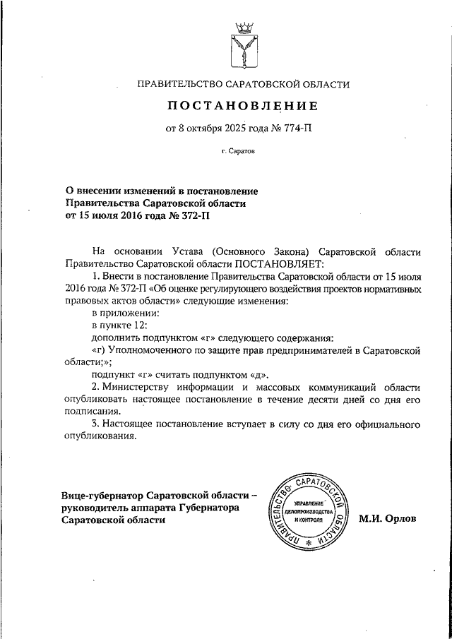 Постановление Правительства Саратовской области от 08.10.2025 N 774-П "О внесении изменений в постановление Правительства Саратовской области от 15 июля 2016 года N 372-П"