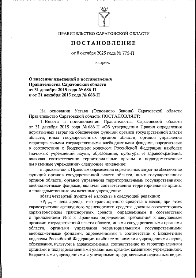 Постановление Правительства Саратовской области от 08.10.2025 N 775-П "О внесении изменений в постановления Правительства Саратовской области от 31 декабря 2015 года N 686-П и от 31 декабря 2015 года N 688-П"