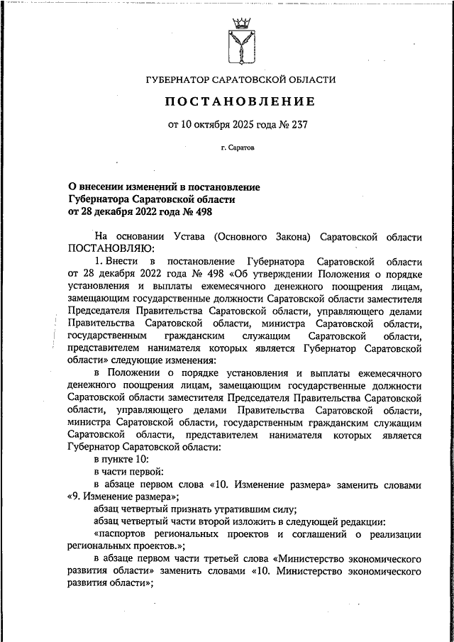 Постановление Губернатора Саратовской области от 10.10.2025 N 237 "О внесении изменений в постановление Губернатора Саратовской области от 28 декабря 2022 года N 498"