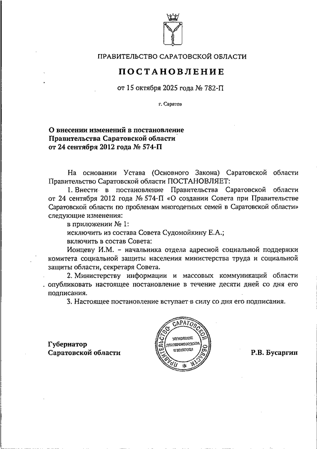Постановление Правительства Саратовской области от 15.10.2025 N 782-П "О внесении изменений в постановление Правительства Саратовской области от 24 сентября 2012 года N 574-П"