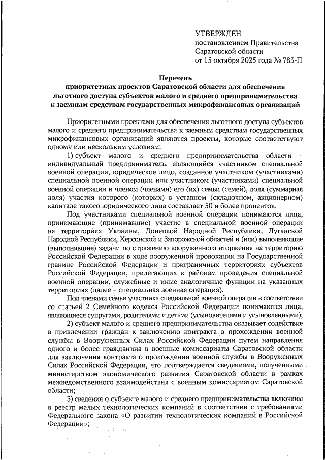 Постановление Правительства Саратовской области от 15.10.2025 N 783-П "Об утверждении перечня приоритетных проектов Саратовской области для обеспечения льготного доступа субъектов малого и среднего предпринимательства к заемным средствам государственных микрофинансовых организаций"