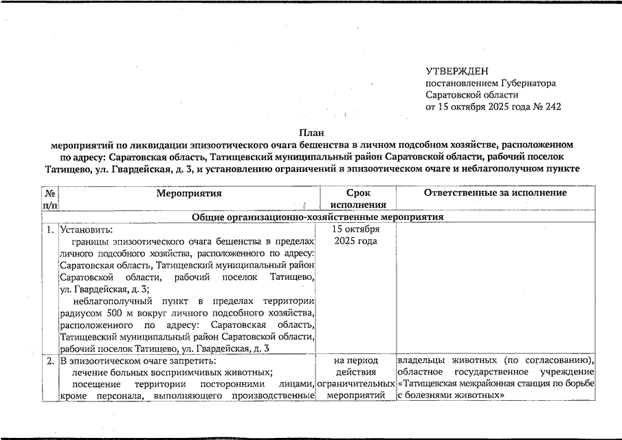 Постановление Губернатора Саратовской области от 15.10.2025 N 242 "Об установлении карантина по заболеванию бешенством животных на территории радиусом 500 м вокруг личного подсобного хозяйства, расположенного по адресу: Саратовская область, Татищевский муниципальный район Саратовской области, рабочий поселок Татищево, ул. Гвардейская, д. 3" (вместе с "Планом мероприятий по ликвидации эпизоотического очага бешенства в личном подсобном хозяйстве, расположенном по адресу: Саратовская область, Татищевский муниципальный район Саратовской области, рабочий поселок Татищево, ул. Гвардейская, д. 3, и установлению ограничений в эпизоотическом очаге и неблагополучном пункте")