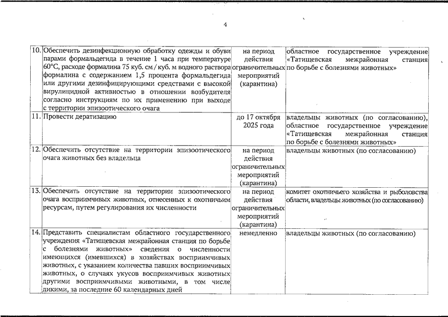 Постановление Губернатора Саратовской области от 15.10.2025 N 242 "Об установлении карантина по заболеванию бешенством животных на территории радиусом 500 м вокруг личного подсобного хозяйства, расположенного по адресу: Саратовская область, Татищевский муниципальный район Саратовской области, рабочий поселок Татищево, ул. Гвардейская, д. 3" (вместе с "Планом мероприятий по ликвидации эпизоотического очага бешенства в личном подсобном хозяйстве, расположенном по адресу: Саратовская область, Татищевский муниципальный район Саратовской области, рабочий поселок Татищево, ул. Гвардейская, д. 3, и установлению ограничений в эпизоотическом очаге и неблагополучном пункте")