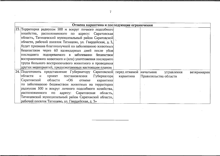 Постановление Губернатора Саратовской области от 15.10.2025 N 242 "Об установлении карантина по заболеванию бешенством животных на территории радиусом 500 м вокруг личного подсобного хозяйства, расположенного по адресу: Саратовская область, Татищевский муниципальный район Саратовской области, рабочий поселок Татищево, ул. Гвардейская, д. 3" (вместе с "Планом мероприятий по ликвидации эпизоотического очага бешенства в личном подсобном хозяйстве, расположенном по адресу: Саратовская область, Татищевский муниципальный район Саратовской области, рабочий поселок Татищево, ул. Гвардейская, д. 3, и установлению ограничений в эпизоотическом очаге и неблагополучном пункте")