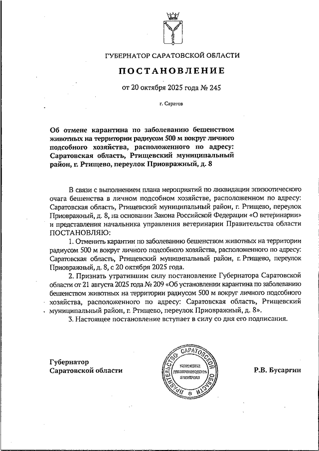 Постановление Губернатора Саратовской области от 20.10.2025 N 245 "Об отмене карантина по заболеванию бешенством животных на территории радиусом 500 м вокруг личного подсобного хозяйства, расположенного по адресу: Саратовская область, Ртищевский муниципальный район, г. Ртищево, переулок Приовражный, д. 8"