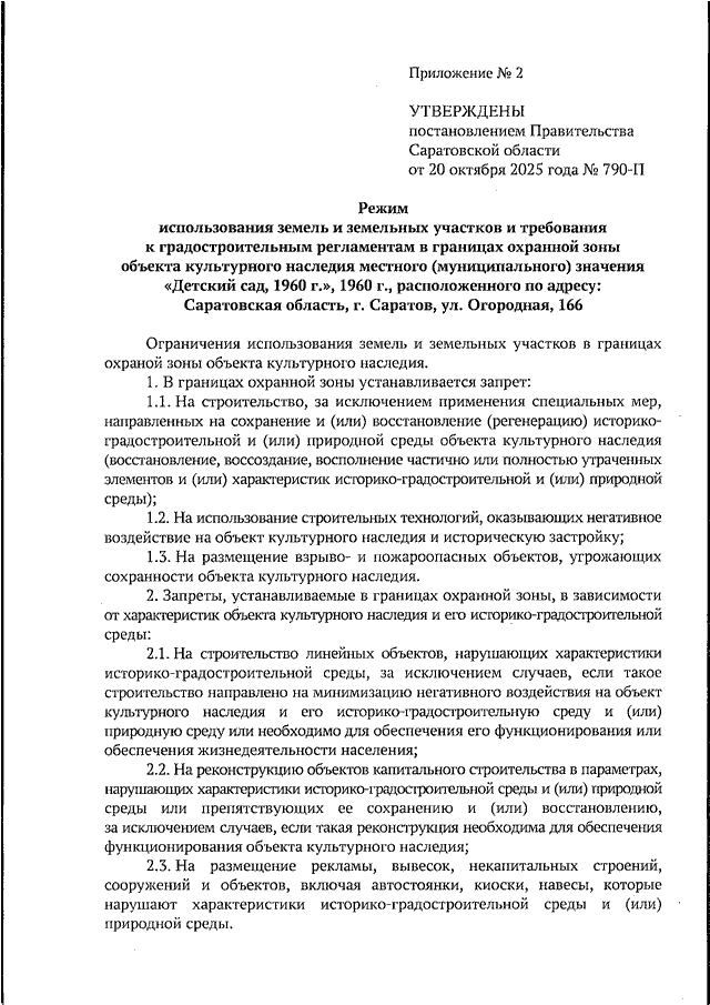 Постановление Правительства Саратовской области от 20.10.2025 N 790-П "Об утверждении зон охраны объекта культурного наследия местного (муниципального) значения "Детский сад, 1960 г.", 1960 г., расположенного по адресу: Саратовская область, г. Саратов, ул. Огородная, 166" (вместе с "Режимом использования земель и земельных участков и требованиями к градостроительным регламентам в границах охранной зоны объекта культурного наследия местного (муниципального) значения "Детский сад, 1960 г.", 1960 г., расположенного по адресу: Саратовская область, г. Саратов, ул. Огородная, 166", "Режимом использования земель и земельных участков и требованиями к градостроительным регламентам в границах зоны регулирования застройки и хозяйственной деятельности объекта культурного наследия местного (муниципального) значения "Детский сад, 1960 г.", 1960 г., расположенного по адресу: Саратовская область, г. Саратов, ул. Огородная, 166")