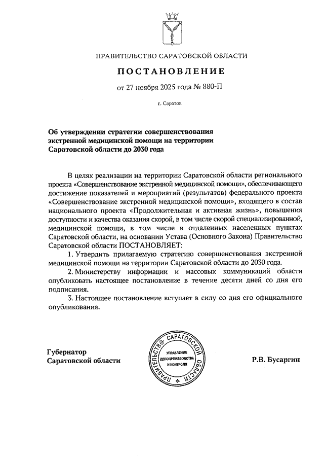 Постановление Правительства Саратовской области от 27.11.2025 N 880-П "Об утверждении Стратегии совершенствования экстренной медицинской помощи на территории Саратовской области до 2030 года"