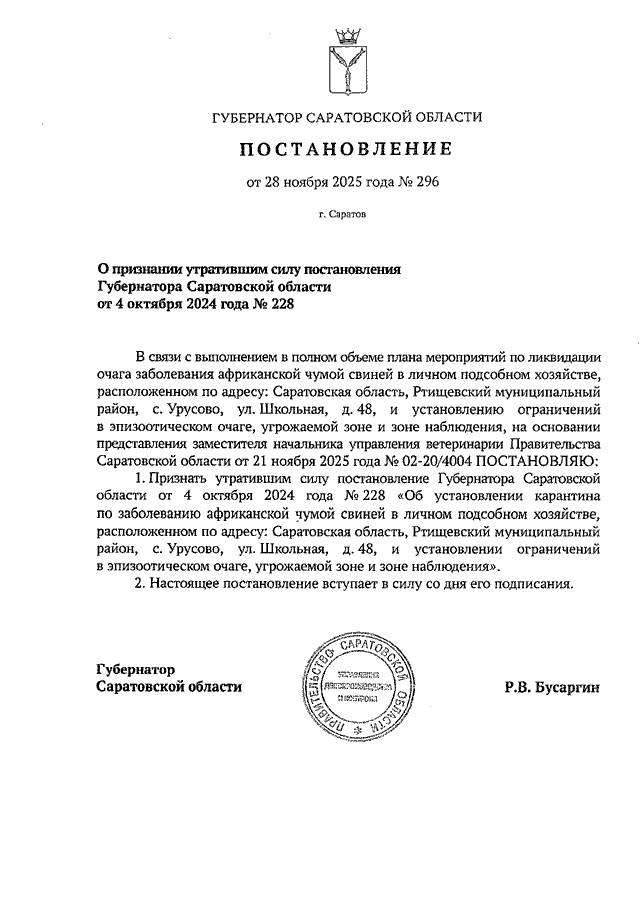 Постановление Губернатора Саратовской области от 28.11.2025 N 296 "О признании утратившим силу постановления Губернатора Саратовской области от 4 октября 2024 года N 228"