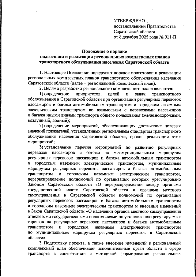 Постановление Правительства Саратовской области от 08.12.2025 N 911-П "Об утверждении Положения о порядке подготовки и реализации региональных комплексных планов транспортного обслуживания населения Саратовской области"