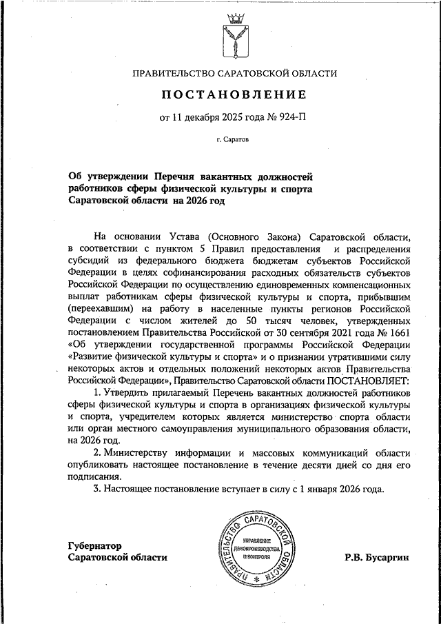 Постановление Правительства Саратовской области от 11.12.2025 N 924-П "Об утверждении Перечня вакантных должностей работников сферы физической культуры и спорта Саратовской области на 2026 год"