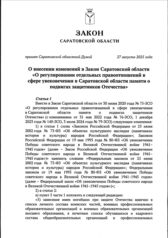 Закон Саратовской области от 02.09.2025 N 64-ЗСО "О внесении изменений в Закон Саратовской области "О регулировании отдельных правоотношений в сфере увековечения в Саратовской области памяти о подвигах защитников Отечества" (принят Саратовской областной Думой 27.08.2025)