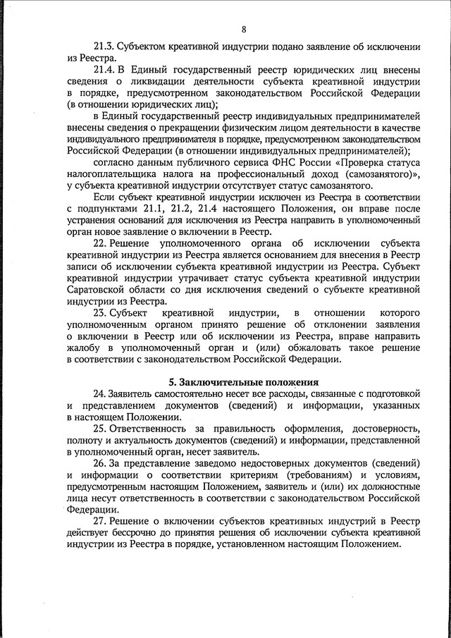 Постановление Правительства Саратовской области от 10.09.2025 N 714-П "О мерах по реализации Закона Саратовской области "О развитии креативных (творческих) индустрий в Саратовской области" (вместе с "Положением о порядке формирования и ведения реестра субъектов креативных (творческих) индустрий, осуществляющих деятельность Саратовской области", "Положением о порядке подтверждения соответствия физических лиц, юридических лиц и индивидуальных предпринимателей критериям отнесения к субъектам креативных (творческих) индустрий, осуществляющих деятельность в Саратовской области", "Положением о порядке размещения информации, указанной в части 2 статьи 14 Федерального закона "О развитии креативных (творческих) индустрий в Российской Федерации", на официальном сайте Правительства Саратовской области в информационно-телекоммуникационной сети Интернет, в том числе сведений об инфраструктуре поддержки креативных (творческих) индустрий в Саратовской области")