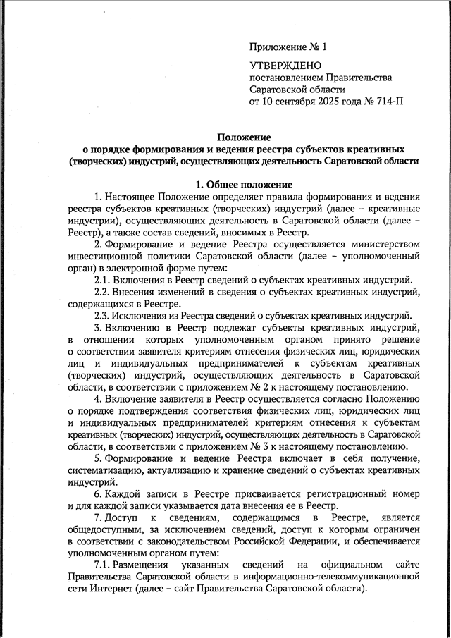 Постановление Правительства Саратовской области от 10.09.2025 N 714-П "О мерах по реализации Закона Саратовской области "О развитии креативных (творческих) индустрий в Саратовской области" (вместе с "Положением о порядке формирования и ведения реестра субъектов креативных (творческих) индустрий, осуществляющих деятельность Саратовской области", "Положением о порядке подтверждения соответствия физических лиц, юридических лиц и индивидуальных предпринимателей критериям отнесения к субъектам креативных (творческих) индустрий, осуществляющих деятельность в Саратовской области", "Положением о порядке размещения информации, указанной в части 2 статьи 14 Федерального закона "О развитии креативных (творческих) индустрий в Российской Федерации", на официальном сайте Правительства Саратовской области в информационно-телекоммуникационной сети Интернет, в том числе сведений об инфраструктуре поддержки креативных (творческих) индустрий в Саратовской области")