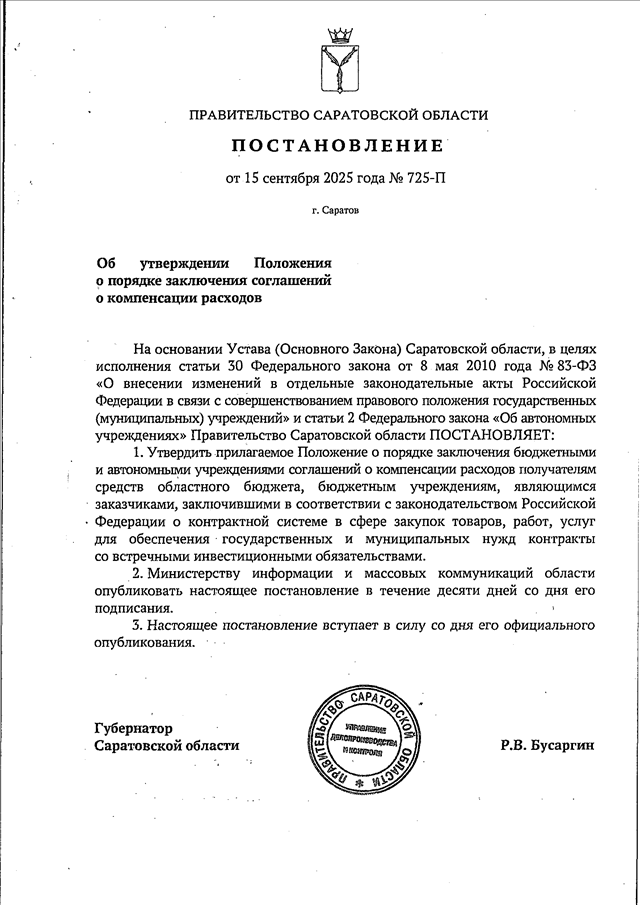 Постановление Правительства Саратовской области от 15.09.2025 N 725-П "Об утверждении Положения о порядке заключения соглашений о компенсации расходов"