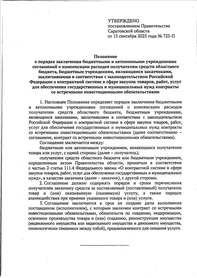 Постановление Правительства Саратовской области от 15.09.2025 N 725-П "Об утверждении Положения о порядке заключения соглашений о компенсации расходов"