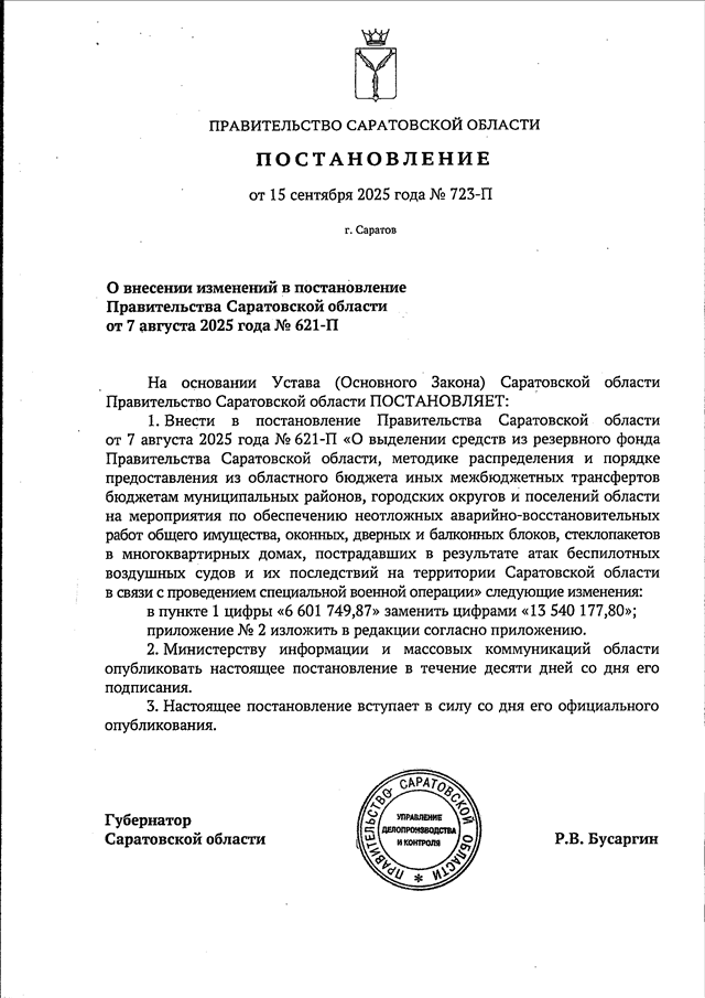 Постановление Правительства Саратовской области от 15.09.2025 N 723-П "О внесении изменений в постановление Правительства Саратовской области от 7 августа 2025 года N 621-П"