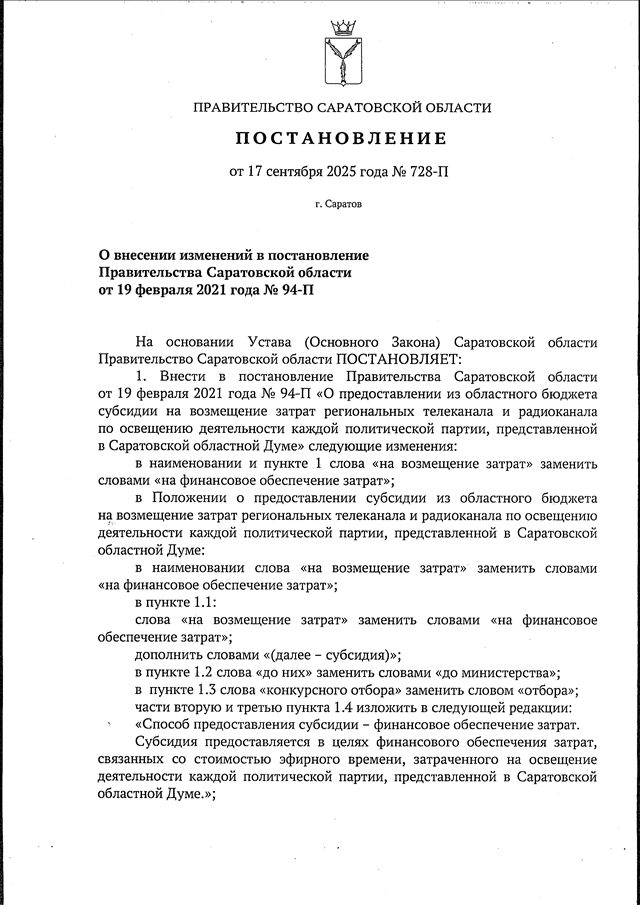 Постановление Правительства Саратовской области от 17.09.2025 N 728-П "О внесении изменений в постановление Правительства Саратовской области от 19 февраля 2021 года N 94-П"