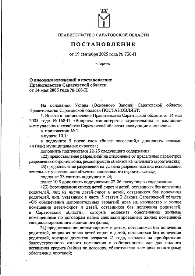 Постановление Правительства Саратовской области от 19.09.2025 N 736-П "О внесении изменений в постановление Правительства Саратовской области от 14 мая 2005 года N 168-П"