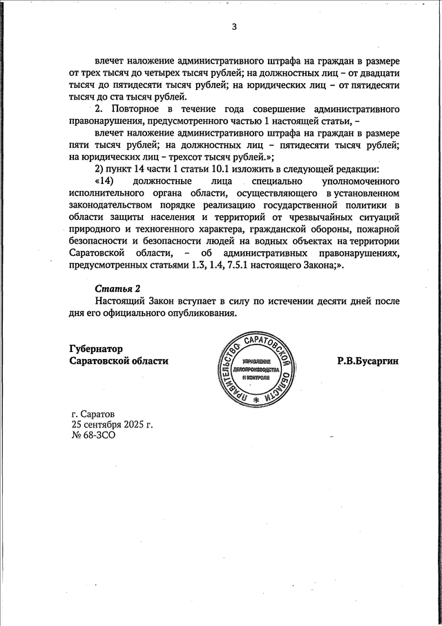 Закон Саратовской области от 25.09.2025 N 68-ЗСО "О внесении изменений в Закон Саратовской области "Об административных правонарушениях на территории Саратовской области" (принят Саратовской областной Думой 24.09.2025)