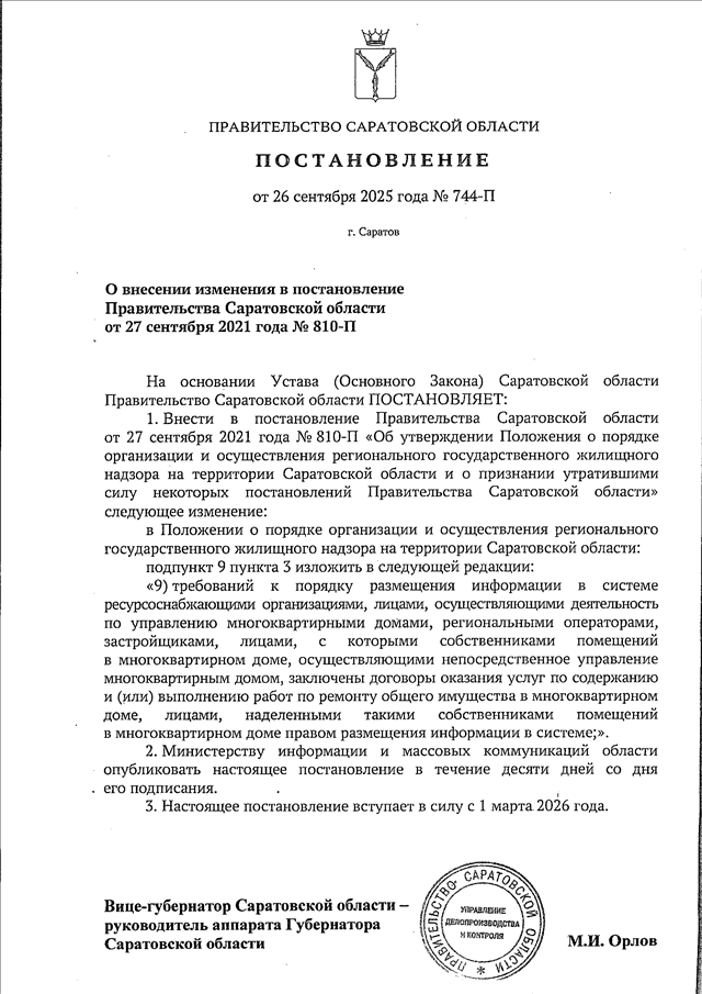 Постановление Правительства Саратовской области от 26.09.2025 N 744-П "О внесении изменения в постановление Правительства Саратовской области от 27 сентября 2021 года N 810-П"