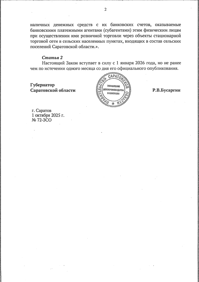 Закон Саратовской области от 01.10.2025 N 72-ЗСО "О внесении изменений в Закон Саратовской области "О введении на территории Саратовской области патентной системы налогообложения" (принят Саратовской областной Думой 24.09.2025)