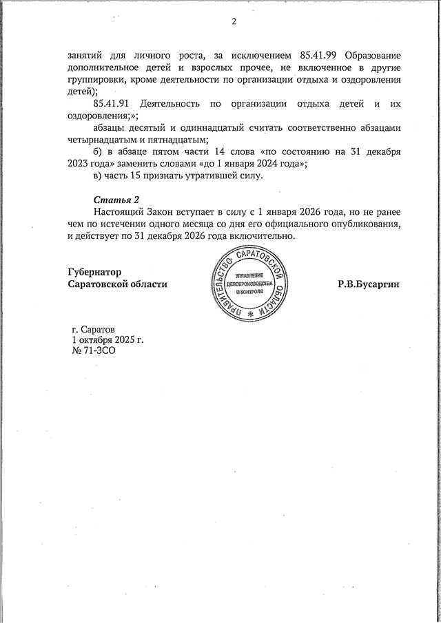 Закон Саратовской области от 01.10.2025 N 71-ЗСО "О внесении изменений в Закон Саратовской области "Об установлении дифференцированных налоговых ставок при применении упрощенной системы налогообложения для отдельных категорий налогоплательщиков на территории Саратовской области" (принят Саратовской областной Думой 24.09.2025)