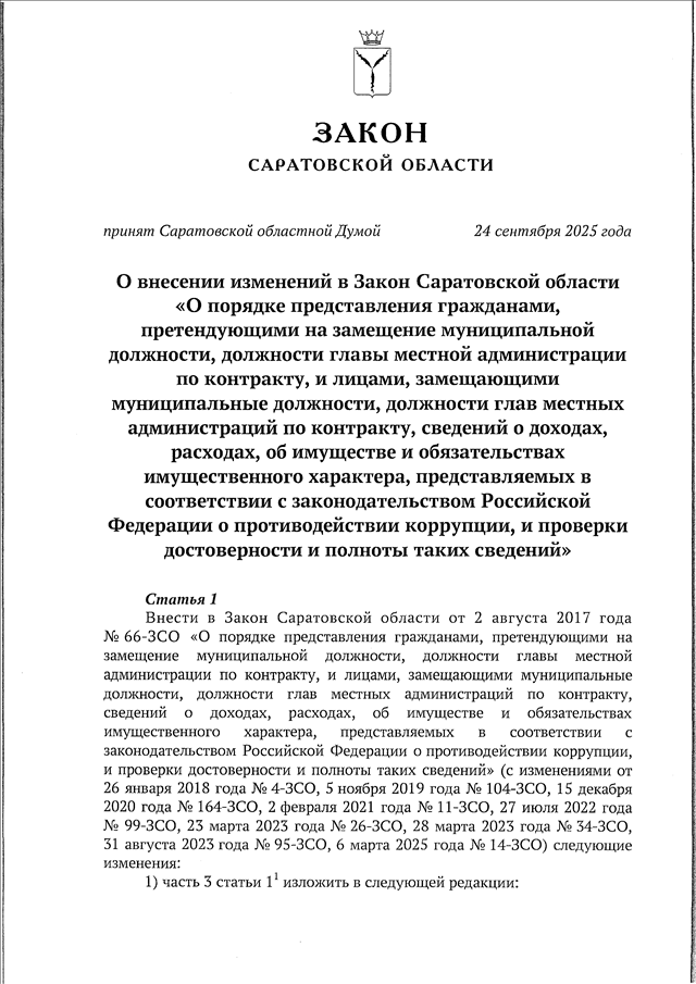 Закон Саратовской области от 01.10.2025 N 70-ЗСО "О внесении изменений в Закон Саратовской области "О порядке представления гражданами, претендующими на замещение муниципальной должности, должности главы местной администрации по контракту, и лицами, замещающими муниципальные должности, должности глав местных администраций по контракту, сведений о доходах, расходах, об имуществе и обязательствах имущественного характера, представляемых в соответствии с законодательством Российской Федерации о противодействии коррупции, и проверки достоверности и полноты таких сведений" (принят Саратовской областной Думой 24.09.2025)