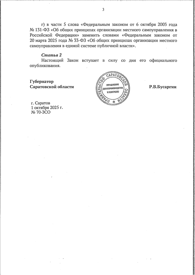 Закон Саратовской области от 01.10.2025 N 70-ЗСО "О внесении изменений в Закон Саратовской области "О порядке представления гражданами, претендующими на замещение муниципальной должности, должности главы местной администрации по контракту, и лицами, замещающими муниципальные должности, должности глав местных администраций по контракту, сведений о доходах, расходах, об имуществе и обязательствах имущественного характера, представляемых в соответствии с законодательством Российской Федерации о противодействии коррупции, и проверки достоверности и полноты таких сведений" (принят Саратовской областной Думой 24.09.2025)