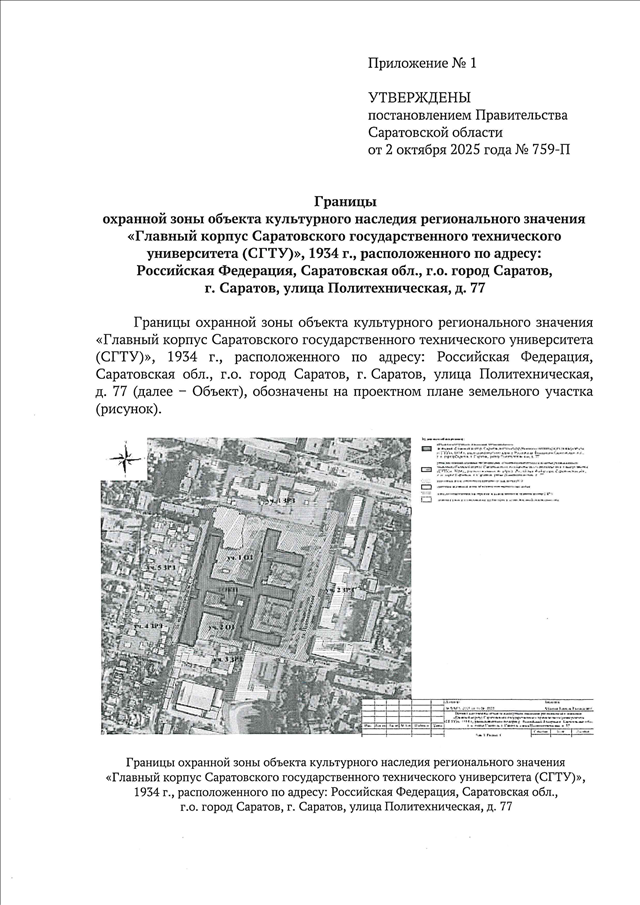 Постановление Правительства Саратовской области от 02.10.2025 N 759-П "Об утверждении зон охраны объекта культурного наследия регионального значения "Главный корпус Саратовского государственного технического университета (СГТУ)", 1934 г., расположенного по адресу: Российская Федерация, Саратовская обл., г.о. город Саратов, г. Саратов, улица Политехническая, д. 77" (вместе с "Режимом использования земель и земельных участков и требованиями к градостроительным регламентам в границах охранной зоны объекта культурного наследия регионального значения "Главный корпус Саратовского государственного технического университета (СГТУ)", 1934 г., расположенного по адресу: Российская Федерация, Саратовская обл., г.о. город Саратов, г. Саратов, улица Политехническая, д. 77", "Режимом использования земель и земельных участков и требованиями к градостроительным регламентам в границах зоны регулирования застройки и хозяйственной деятельности объекта культурного наследия регионального значения "Главный корпус Саратовского государственного технического университета (СГТУ)", 1934 г., расположенного по адресу: Российская Федерация, Саратовская обл., г.о. город Саратов, г. Саратов, улица Политехническая, д. 77")