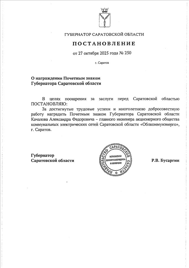 Постановление Губернатора Саратовской области от 27.10.2025 N 250 "О награждении Почетным знаком Губернатора Саратовской области"