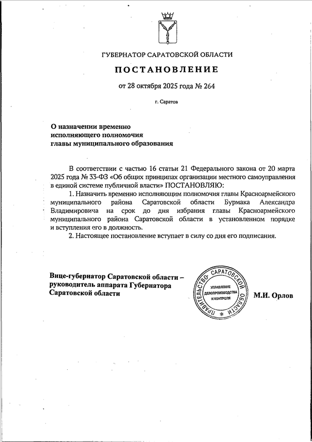 Постановление Губернатора Саратовской области от 28.10.2025 N 264 "О назначении временно исполняющего полномочия главы муниципального образования"