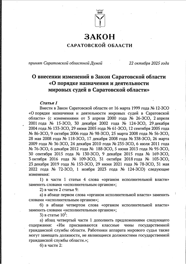 Закон Саратовской области от 29.10.2025 N 77-ЗСО "О внесении изменений в Закон Саратовской области "О порядке назначения и деятельности мировых судей в Саратовской области" (принят Саратовской областной Думой 22.10.2025)