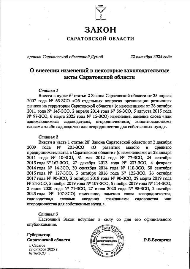Закон Саратовской области от 29.10.2025 N 76-ЗСО "О внесении изменений в некоторые законодательные акты Саратовской области" (принят Саратовской областной Думой 22.10.2025)