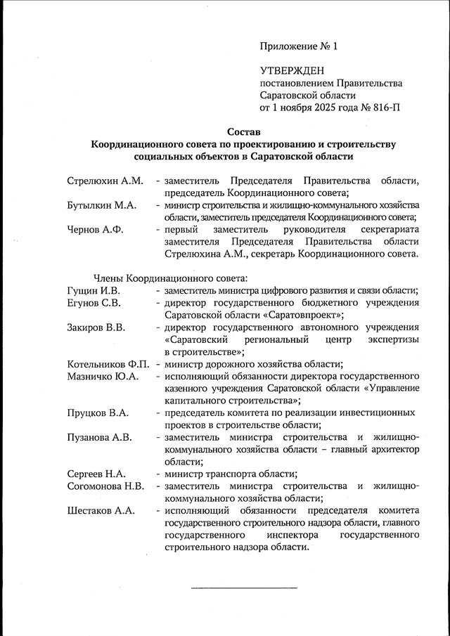 Постановление Правительства Саратовской области от 01.11.2025 N 816-П "О создании Координационного совета по проектированию и строительству социальных объектов в Саратовской области"