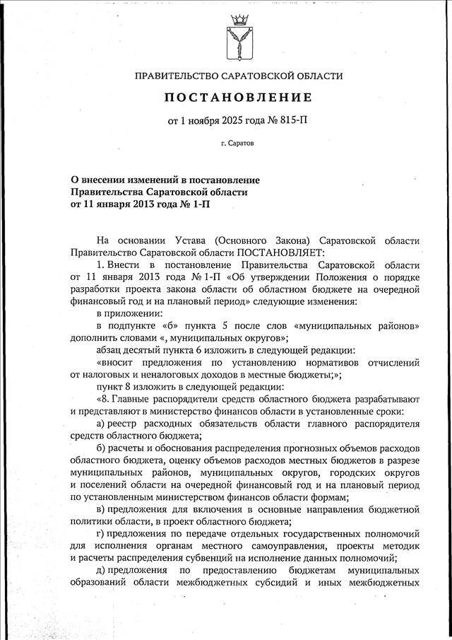 Постановление Правительства Саратовской области от 01.11.2025 N 815-П "О внесении изменений в постановление Правительства Саратовской области от 11 января 2013 года N 1-П"